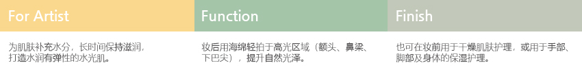 于妆前或妆后,使用化妆海绵或双手均匀涂抹于肌肤。