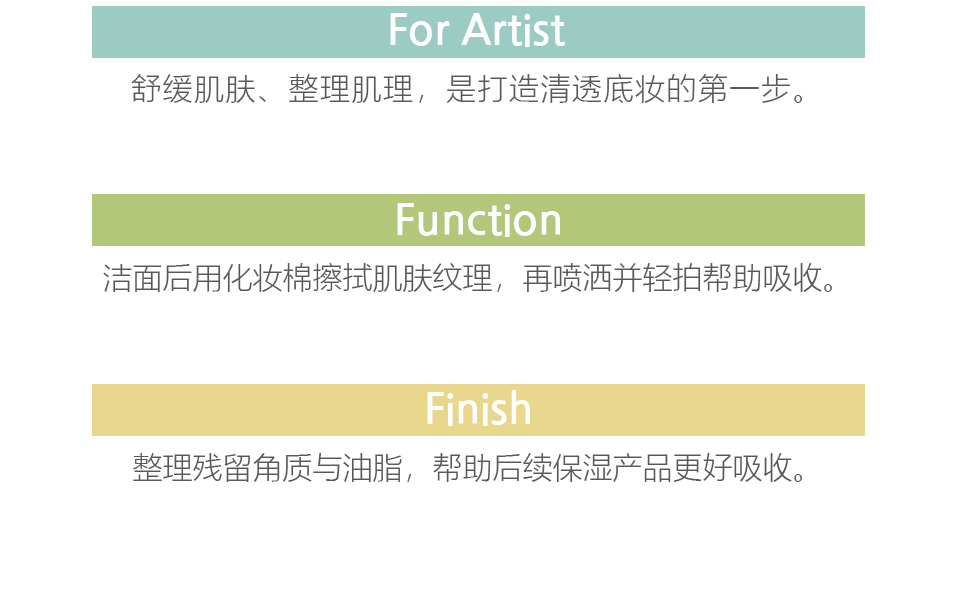 或将适量喷于化妆棉上,顺着肌肤纹理进行整理护理。