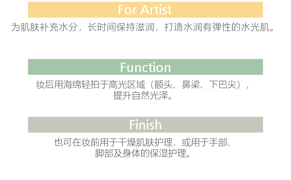 于妆前或妆后,使用化妆海绵或双手均匀涂抹于肌肤。